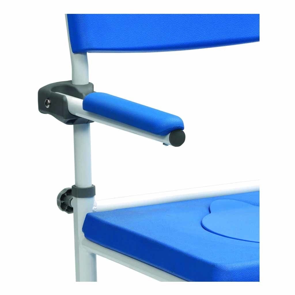 De Aston 24" is een combinatie van een douchestoel en toiletstoel met grote wielen. Door de grote achterwielen met hoepels is het voor de gebruiker mogelijk deze zelf voort te bewegen. Het hoge kwaliteit ge-poedercoate aluminium frame zorgt ervoor dat deze niet kan roesten. Verder is de Aston 24" uitgerust met in hoogte verstelbare voetsteunen, wegklapbare armsteunen, grote achterwielen met hoepels en parkeerrem en een uitneembare hygiëne uitsparing. Wanneer deze als toiletstoel wordt gebruikt dient u de hygiëne uitsparing te verwijderen en de toiletemmer onder de zitting in de beugel te schuiven. De zachte zitting en rugleuning zorgen voor extra comfort tijdens gebruik. De grote achterwielen van deze verrijdbare toiletstoel / douchestoel zijn elk voorzien van een handrem, hierdoor is het mogelijk dat de gebruiker de douche-/toiletstoel zelf op de rem kan zetten. Dit zorgt ervoor dat de stoel niet weg kan rijden tijdens gebruik.