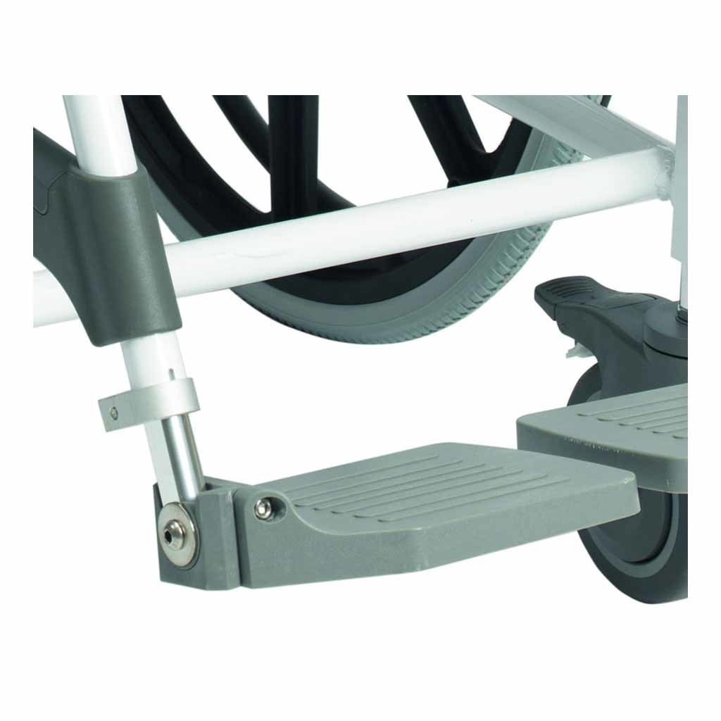 De verrijdbare douchestoel / toiletstoel heeft afneembare in hoogte verstelbare voetsteunen. Zodat de voetsteunen voor de gebruiker in een comfortabele hoogte afgesteld kunnen worden. En wanneer deze niet nodig zijn kunnen de voetsteunen door een éénvoudige handeling van de douche-/toiletstoel verwijderd worden.